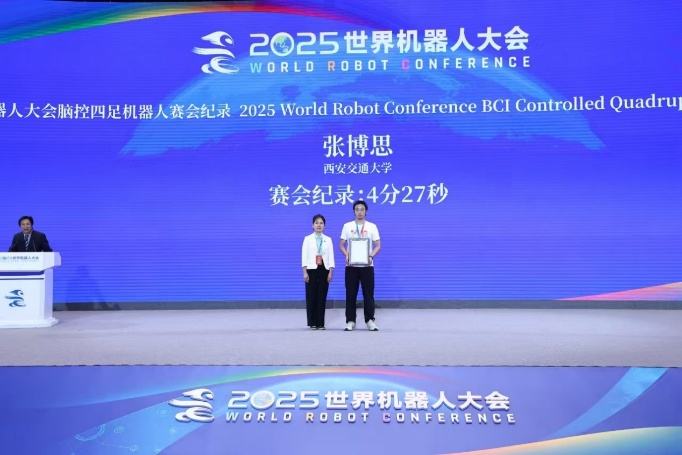选手张博思以4分27秒的成绩完成“8字形赛道”及握手等交互任务,达到手动操作速率的85%,标志着脑机接口技术在实际场景中完成复杂路径与交互任务的可行性不断提升,该成绩也被列入2025年度脑控四足机器人赛会纪录。