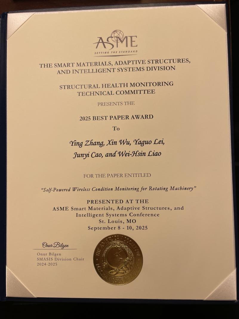 2025年9月8-10日,美国机械工程师学会(ASME)旗下的会议Smart Materials, Adaptive Structures, and Intelligent Systems (SMASIS)在美国密苏里州顺利举行。因西安交大张颖在自供能智能健康监测领域的重要贡献,荣获了ASME2025年度“结构健康监测(Structural HealthMonitoring)”唯一最佳论文奖(Best Paper Award)。