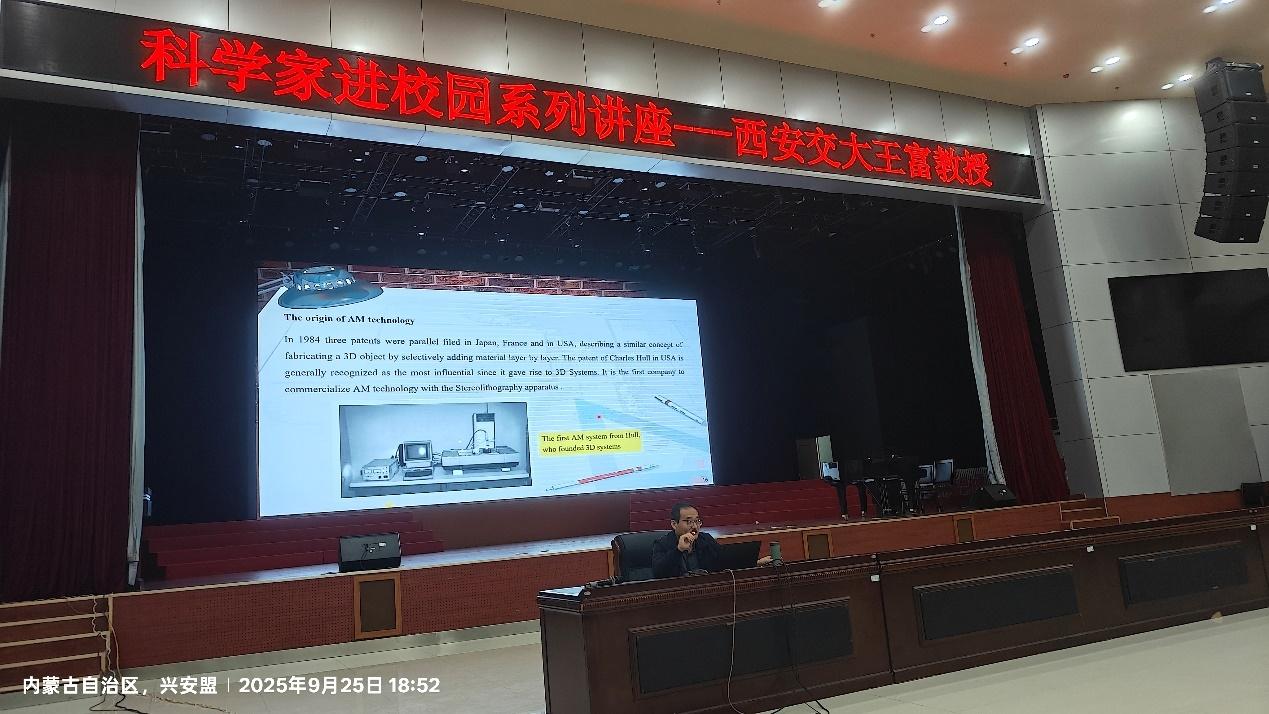 青年拔尖人才、特聘教授王富走进内蒙古乌兰浩特第一中学、乌兰浩特第四中学和突泉县第一中学,为中学生做了一场精彩的"增材制造技术及其应用"的科普讲座。此次活动既是面向中学生的科技知识普及,也是吸引优秀学子报考我院的重要组成部分。