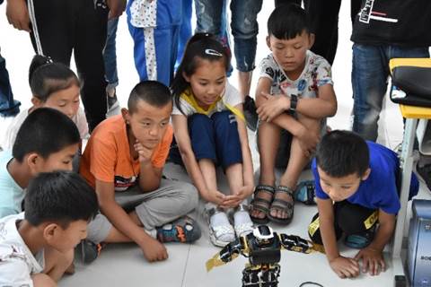 实践团也带来了徐光华老师科研团队研发的体感随动机器人,并向孩子们进行了展示。孩子们在体感摄像头前做一些肢体运动,机器人便会跟随模仿孩子们的肢体动作,孩子们在体验中领略到了先进科技所带来的魅力。