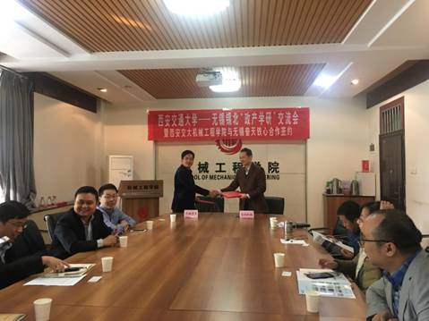 王小鹏副教授与无锡普天铁心股份有限公司梁林秋副董事长签署合作协议,进一步深化无锡普天铁心股份有限公司与西安交大的合作。