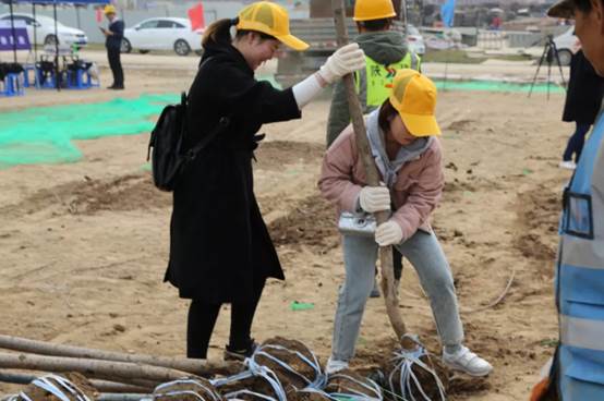 兴庆校区思源广场出发。到达创新港之后,大家按提前分好的队进行有序的领取工具与树苗,铁锹、鹤嘴锄、水桶一样样工具被领走,随后便积极参与植树活动中。由于创新港属于新区开发,地质较硬,但是大家撸起袖子,拿起锄头就是刨,本着大坑不出便不休息的理念一直刨下去,无论遇到坚硬的石头还是硬质土地大家都丝毫不泄气,干到热火朝天甚至抛开工具,直接上手,一点一点的将坑挖出来,种下树苗,埋好土接水灌溉,然后再次进行上述的步骤,一棵两棵,不一会儿,原本荒秃秃的土地上就树起了成片的象征着希望的小树苗。