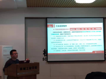 紧接着杨老师介绍了团代会的选举程序,强调团代会的程序是严格规范的,要求每一位团支书明晰其选举程序,并在后期组织本团支部的团代表和委员推荐会议上严格遵守选举程序。