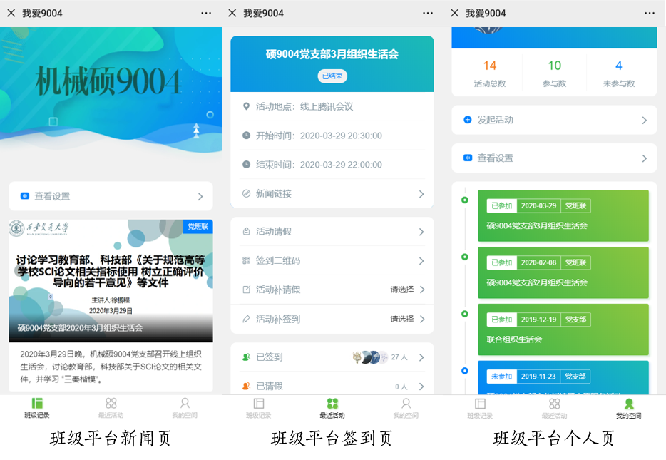 新学期伊始,支部本着数字化班级建设和数字化党支部建设的思想,牵头建立了用于记录班级及支部点滴、服务班级及支部管理的线上平台——“我爱9004”。平台中按“班集体”、“党支部”、“党班联”等多个维度对班级及支部组织的各项活动进行了记录,为大家留存下了每一刻温暖的点滴回忆。通过平台的活动动态签到功能,使每位同学的活动参与情况一点就知,这提升了同学们对于班级和党支部活动参与的热情。线上平台的建立,为党支部和班级建设提供了一种新的思路和依托。