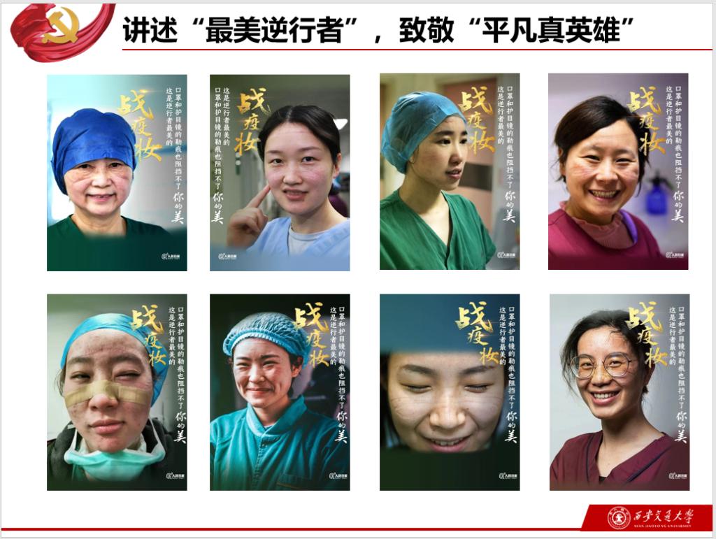 疫情当前,更是考验党员能否牢记使命的时候,更能彰显坚定理想信念的品格。抗疫期间涌现出许多感人事迹,党员们一起“讲述‘最美逆行者’,致敬‘平凡真英雄’”。可能是从新闻报道中获知,可能就是身边的亲人朋友,他们舍小家、为大家,为防控疫情做出了巨大贡献,甚至许多医护工作者失去了宝贵的生命。疫情正值春节,许多医护人员放弃与家人团聚前往湖北支援,他们脸上被防护装备勒出一道道血痕,为了节省防护装备,经常一天只吃一顿饭,他们在繁重的工作面前往往每天只能休息几个小时,他们是“最美逆行者”;除了医护人员,还有方舱等医院的建设者、外卖小哥、送餐老板等等许多自愿为抗击疫情做出贡献的人,他们平凡却伟大,他们是“平凡真英雄”。同时,我们国产探花