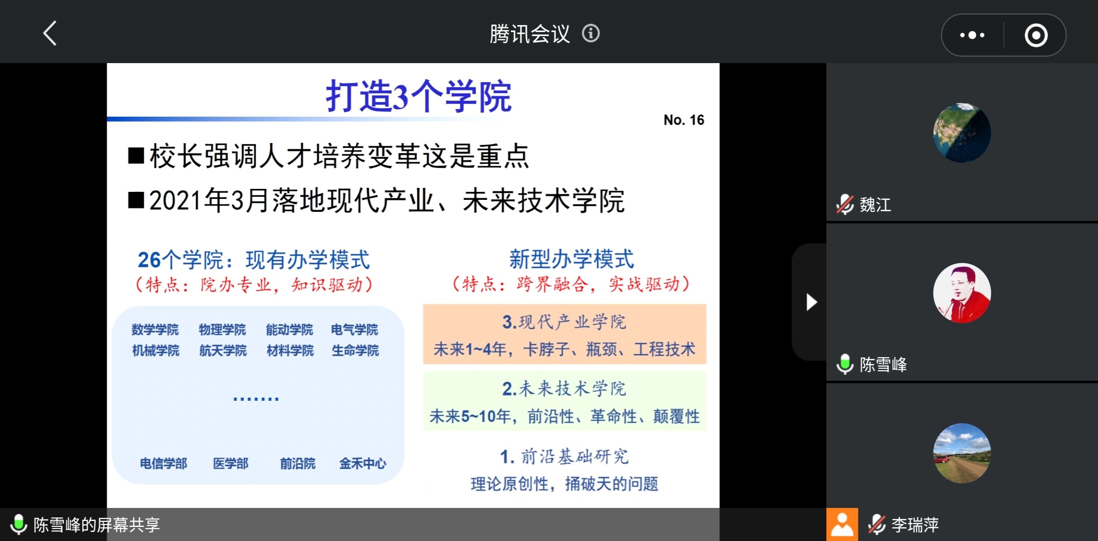 陈院长指出学院已通过成立智能制造创新中心探索人才培养模式变革,将在现有办学模式下,借鉴如Olin工学院等人才培养理念,继续做好立德树人相关工作,持续建设好工程研究岗教师队伍,探索实施“以产学研深度融合、业绩贡献为导向,科技成果转化业绩等纳入考核评价体系等的“破五唯”评价方式。