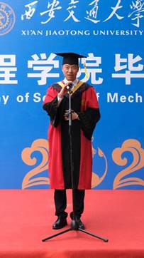 院长陈雪峰发表总结演讲。陈院长期望毕业生无论在什么岗位上,都要成为交大机械学科的宣传者,都要做出更好的成绩,作出更大的贡献,为机械工程学科发展贡献自己的力量,并且要勇于承担国家使命、社会使命和交大机械学科永居第一的使命。