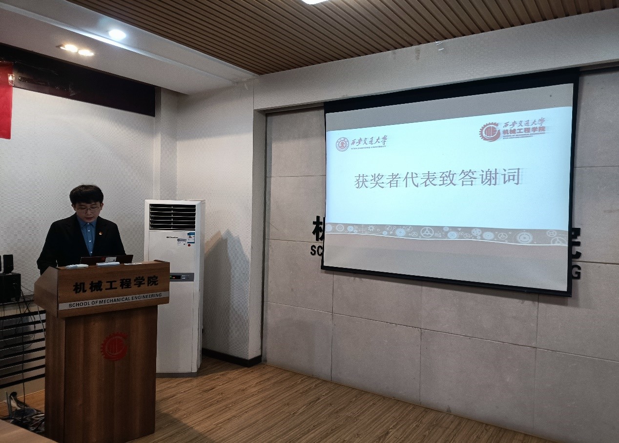 颁奖仪式之后,博士研究生张书源代表获奖学生发言,表达对母校、老师、同学以及NSK公司感激之情,并表示将继续以锐意创新的勇气、敢为人先的锐气、蓬勃向上的朝气努力提高自己,发扬西迁老教授的无私奉献、以国家利益为己任的西迁精神,志存高远,脚踏实地,向NSK公司一样怀着一颗感恩的心回报社会,并祝愿NSK公司蒸蒸日上,再创辉煌。