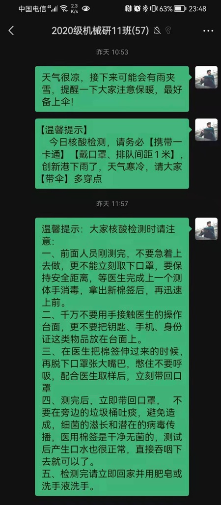 S0011支部积极发挥线上力量作用,支部成员将朋友圈作为自己的主战场,不断为大家提供便捷信息服务,还细心提醒同学们带伞添衣,为冬日里排队做核酸的同学带去了一份温暖。