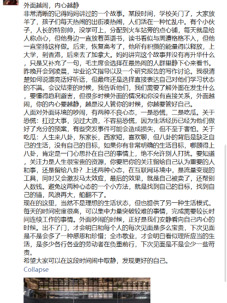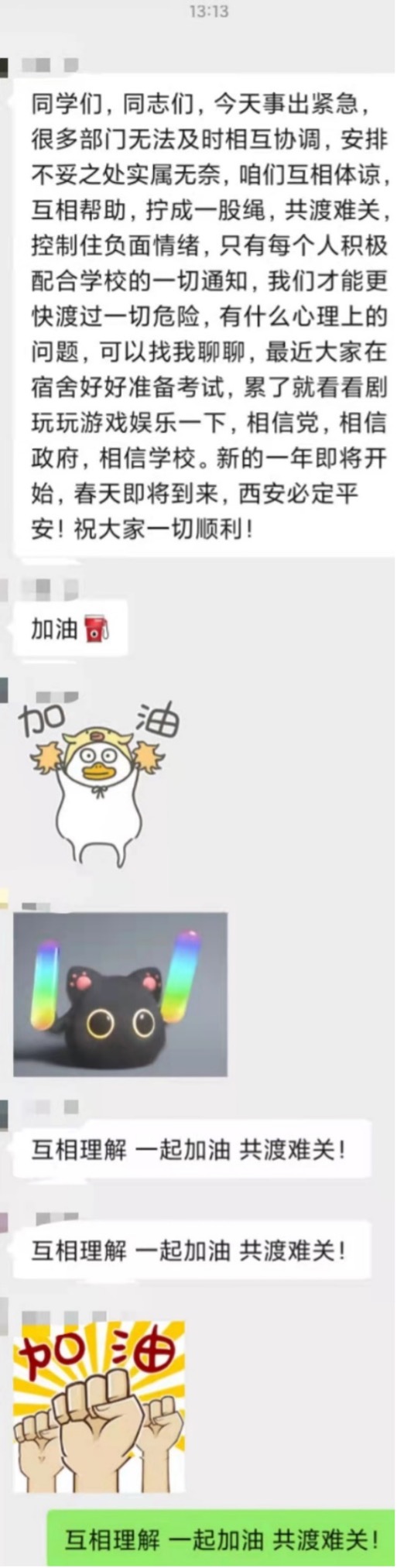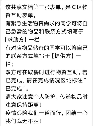 在封控消息下来之后,考虑到复杂多变的疫情形势可能会引发同学们的不安,学院及时发布消息,号召同学们不信谣,不传谣,及时关注防疫平台官方消息,有信心、有担当,勇担责任,共克时艰。与此同时,学院兼职辅导员队伍、研究生党建办公室、学院团工委直属部门、研究生会、常代会等学院各级组织和许多同学也开始自发安抚其他同学躁动的情绪,虽不能见面,文字亦可传达温暖的力量。