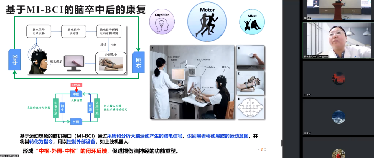 林强博士分享了“脑机接口技术在脑卒中康复的临床实践及机制探讨”,从功能障碍与MI-BCI作用机理、MI-BCI的临床治疗处方制定、MI-BCI干预介导的神经可塑性机制在临床实践中的体现、MI-BCI干预的局限性和挑战四个方面详尽的解释了脑机接口技术通过运动想象实现了从中枢—外周—中枢的闭环康复理论。并提出希望以后能更好的医工交叉融合,把BCI技术真正的应用到临床。
