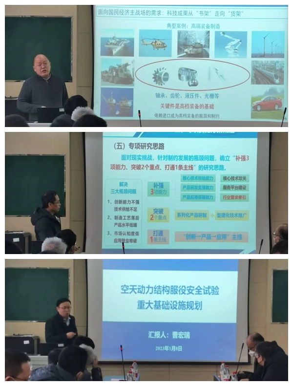 刘红忠教授作了《见微知著,睹始知终——微纳制造及感知》的主题报告,从国家“深地、深空、深蓝”重大需求切入,强调要从国家需求导向中提炼科学问题,突破关键技术,把科技命脉牢牢掌握在自己手中。他提出了面向国家需求的人才汇聚、科学创新、技术突破的发展思路,并探讨了未来的科技发展趋势。赵立波教授作了《智能传感器》的主题报告,他介绍了传感器科技创新的当前形势,概述传感器专项研究思路、专项任务主要服务场景、专项预期成果以及预期成果的支撑作用。曹宏瑞教授作了《空天动力结构服役安全大科学装置研究规划》的主题报告,他围绕国家提高空天发动机结构安全性、可靠性的重大需求,介绍由李应红院士领衔,西安交大、青岛市政府等联合规划的我国首个系统性、综合性、先进性的空天动力试验基地与研发中心的总体建设方案以及组织管理模式,该试验基地与研发中心将有力支持我国空天动力的自主研制与创新发展。