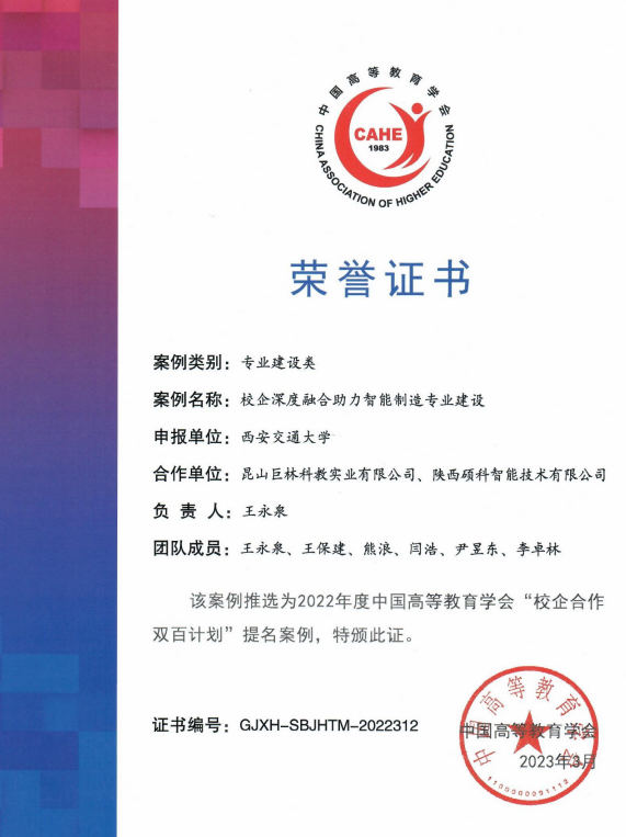 与昆山巨林科教有限公司、陕西硕科智能技术有限公司、西安吉利汽车等各方优势,打破知识壁垒,促进产教融合,依托平台开发高阶性教学项目,开发示范性案例与教材,建成资源融合充分、结构体系完整、学科特色鲜明的实践教学体系,支撑传统专业转型升级和智能制造工程专业建设,推动和引领了新型工程科技人才培养理念及模式改革。