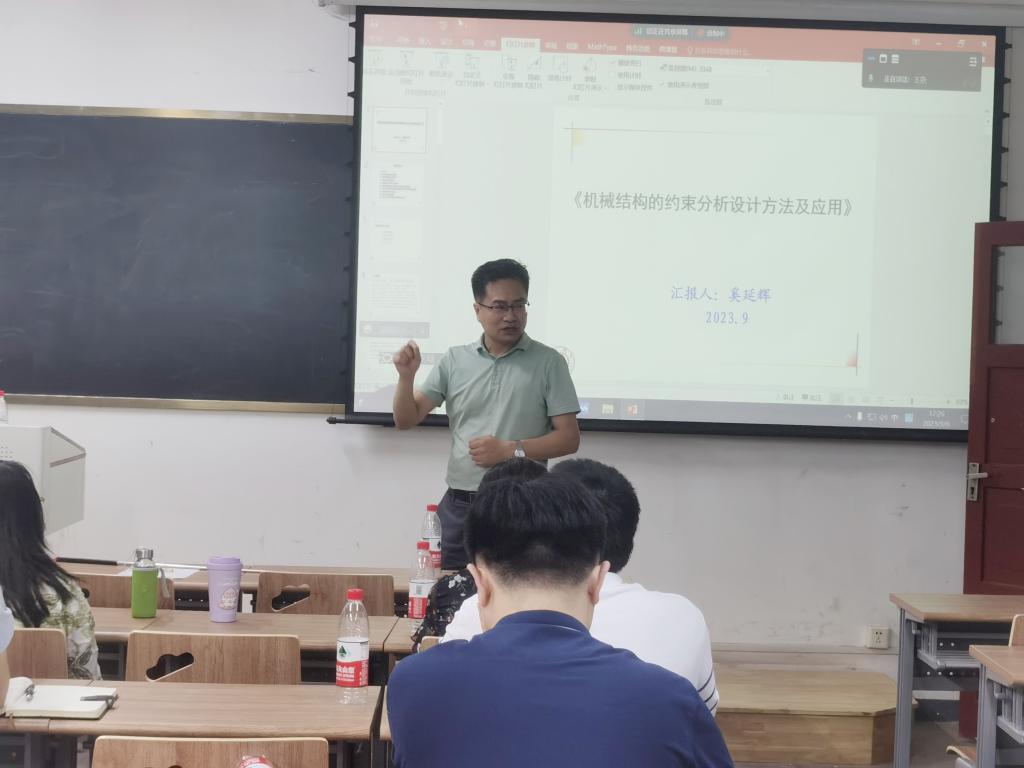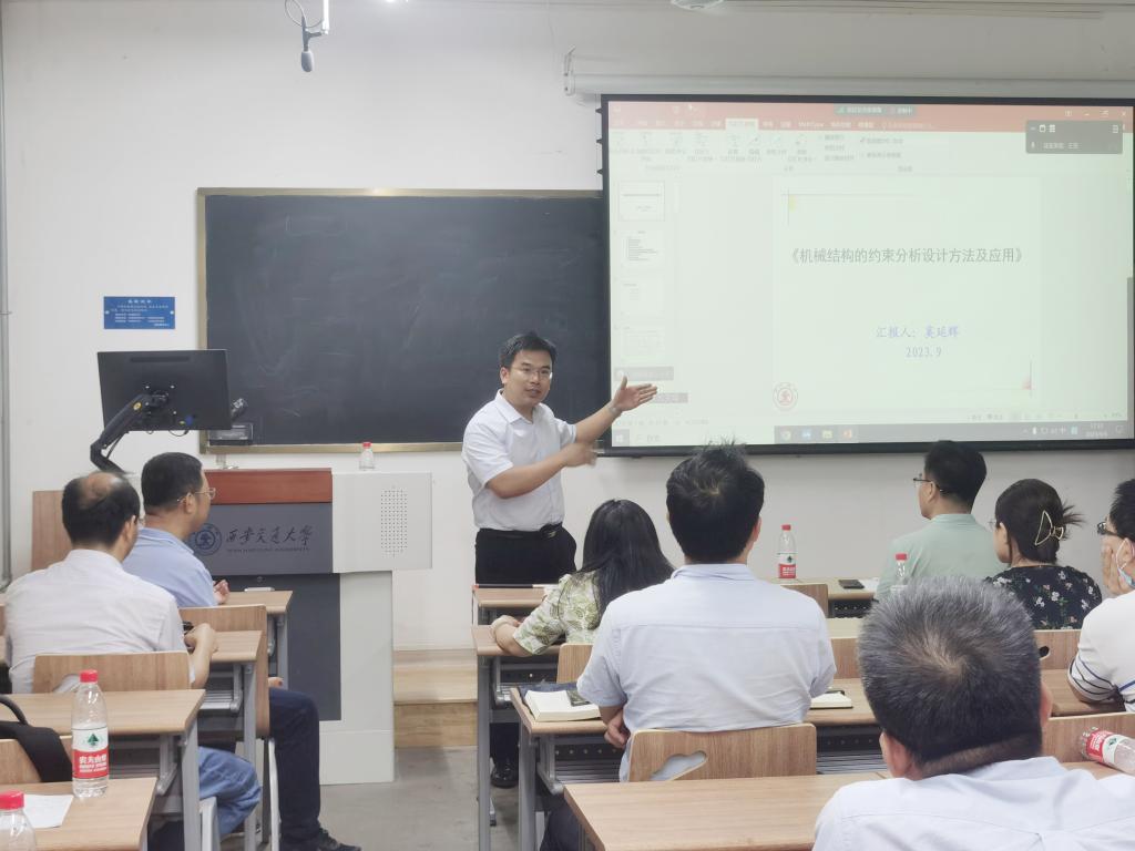 奚延辉教授分享了自己从教40年的教学心得,并结合长期工程设计实践中的思考,作了题为《机械结构的约束分析设计方法及应用》的报告。奚教授重点强调了教学工作中态度、课堂互动和内容深度三个方面的重要性,并围绕问题来源、思考历程、重新认识和设计启发等方面,系统讲解了机械结构约束分析设计的理论和方法体系,与课程组老师进行了深入交流。