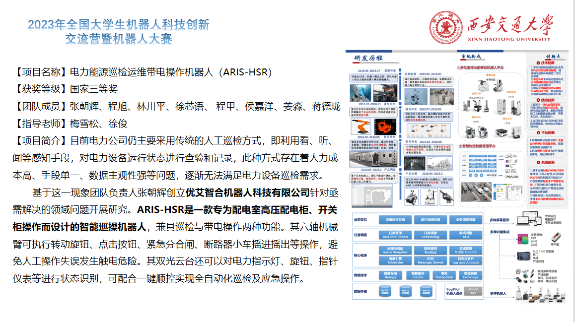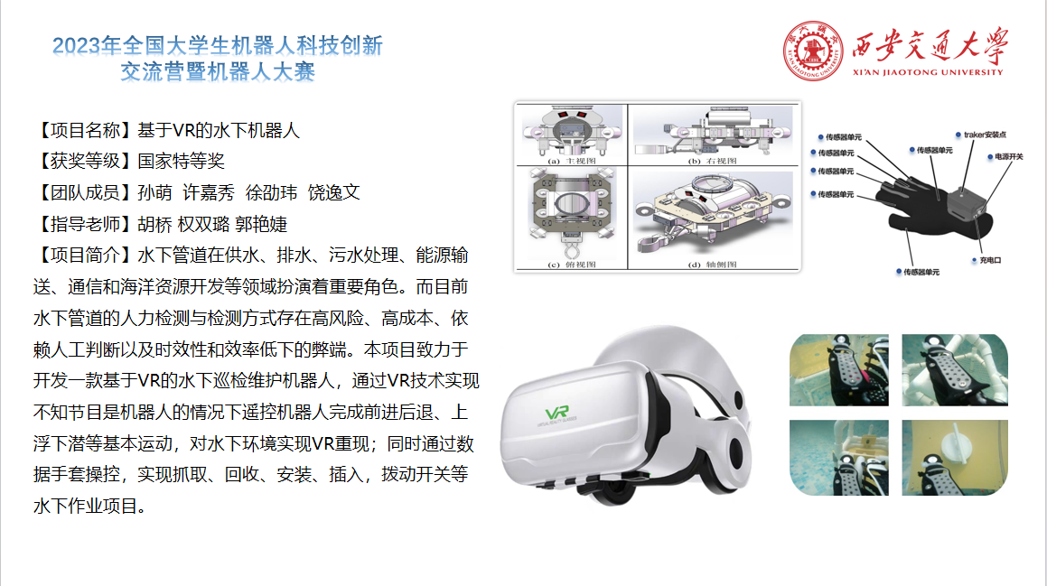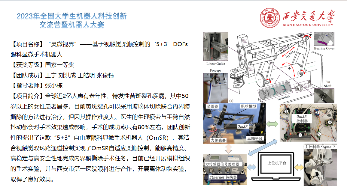 胡桥、权双璐、郭艳婕老师指导的“基于VR的水下机器人”项目荣获特等奖;张小栋老师指导的“灵微视界——基于视触觉柔顺控制的‘5+3’DOFs眼科显微手术机器人”项目荣获一等奖;梅雪松、徐俊老师指导的“电力能源巡检运维带电操作机器人(ARIS-HSR)”项目荣获三等奖。