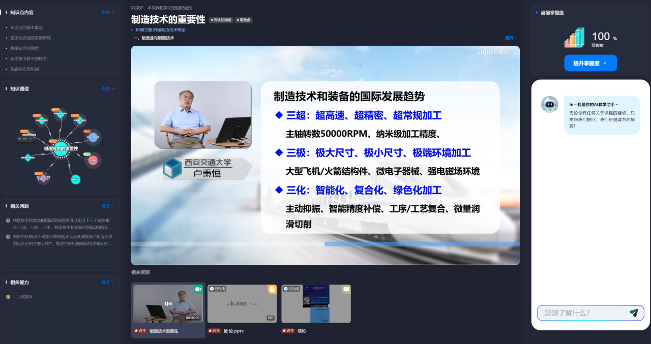 又一次迈出了坚实的步伐。今日,国家级一流本科线下课程《机械制造技术基础》知识图谱课程正式在智慧树平台上线。课程由卢秉恒院士指导,赵万华教授和洪军教授策划把关,张俊教授总体负责实施,刘弘光教授、吕盾副教授、李旸副教授、王春慧副教授、张星副教授、位文明副研究员、金涛讲师等11位老师共同参与。