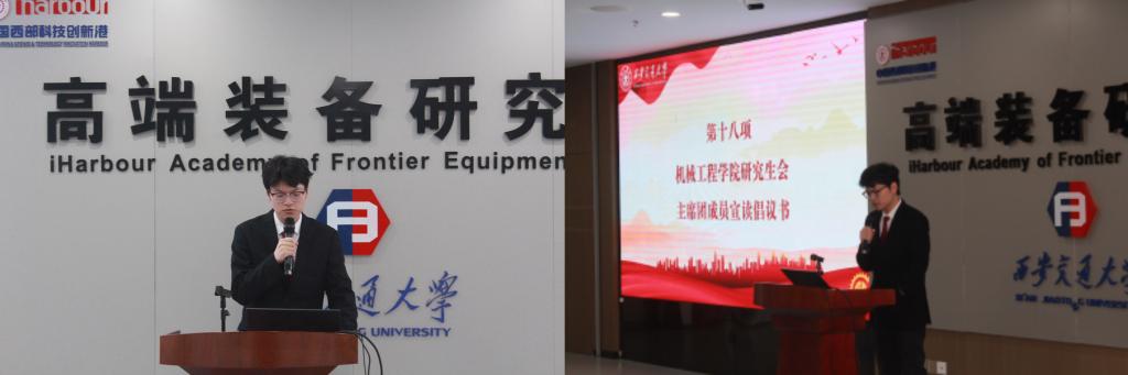 校研究生会主席团成员候选人熊峰致辞,他首先肯定了校院两级研会过去一年在思想引领、服务同学等工作中取得的成绩,特别是校研会当选全国学联第二十八届主席团团体单位,国产探花 研会组织建设与服务质量突出。同时对机械研会的下一步工作提出了建议与期待。能源与动力工程学院研究生会主席团成员邓淼俐交流发言,她表示,能动学院与国产探花 同源而出,相向而行,在学科建设、学院建设与学生工作等方面密切合作,培养了浓厚的兄弟情谊。在新时代的发展浪潮中,两院将继续携手共进,共同推进学校工科建设发展,为祖国的发展建设添砖加瓦。