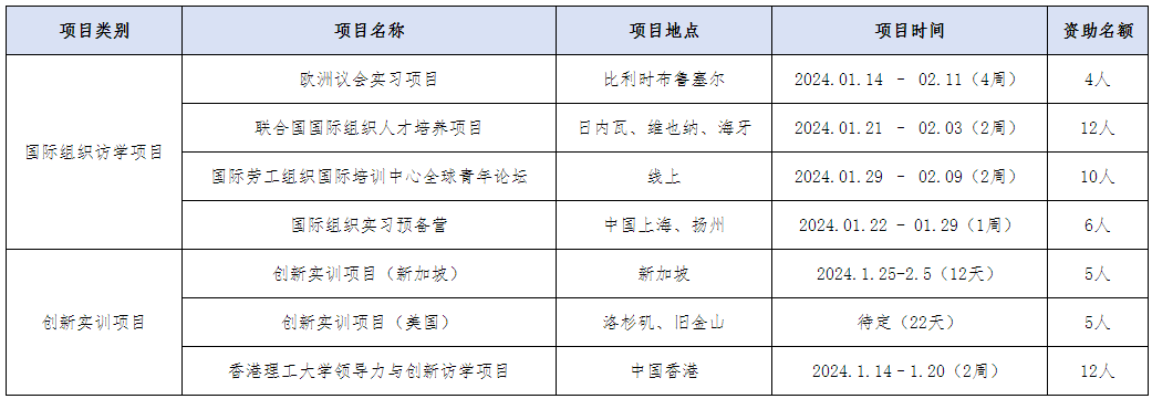 为加快培养具有扎实外语基础、通晓国际规则、具有世界眼光、创新精神、国际视野的精英人才,更好地服务于国家发展战略,学校将推选、资助54名优秀学生于2024年寒期参加以下7个国际组织访学及创新实训项目。