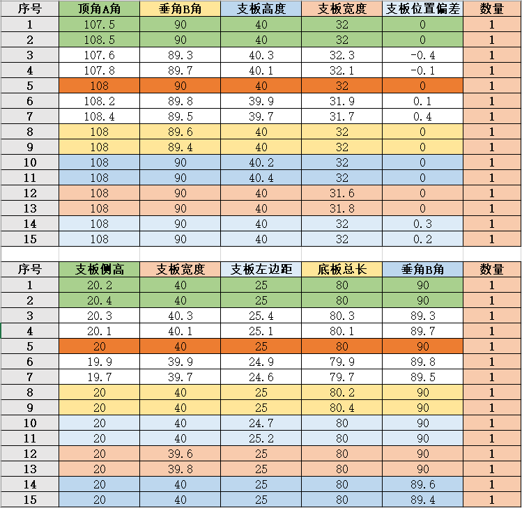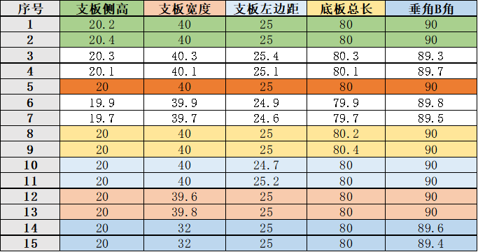 同相似件1,设置支板侧高、支板宽度、支板左边距、底板总长和垂角五个变量,支板侧高分为20.2mm与20.4mm两组,支板宽度分为39.6mm与39.8mm两组,支板左边距分为24.7mm与25.2mm两组,底板总长分为80.2mm与80.4mm两组,垂角分为89.6度与89.4度两组,共10个零件,非控制变量组4个零件尺寸见表,与控制变量组的零件形成对照,加上参考的零件本身,总计15个零件,如上表所示。