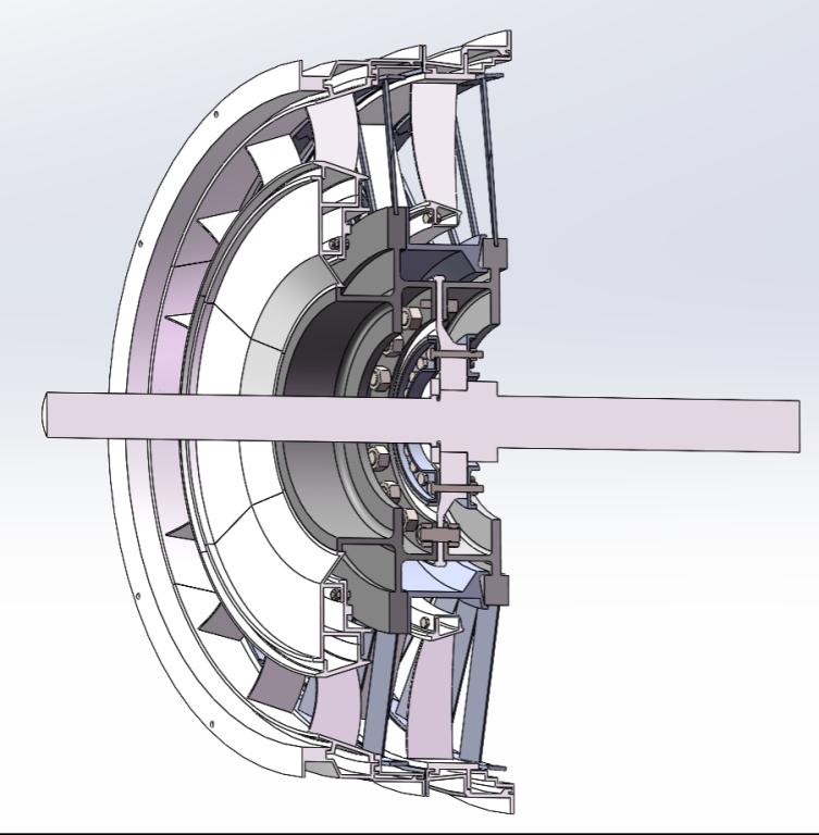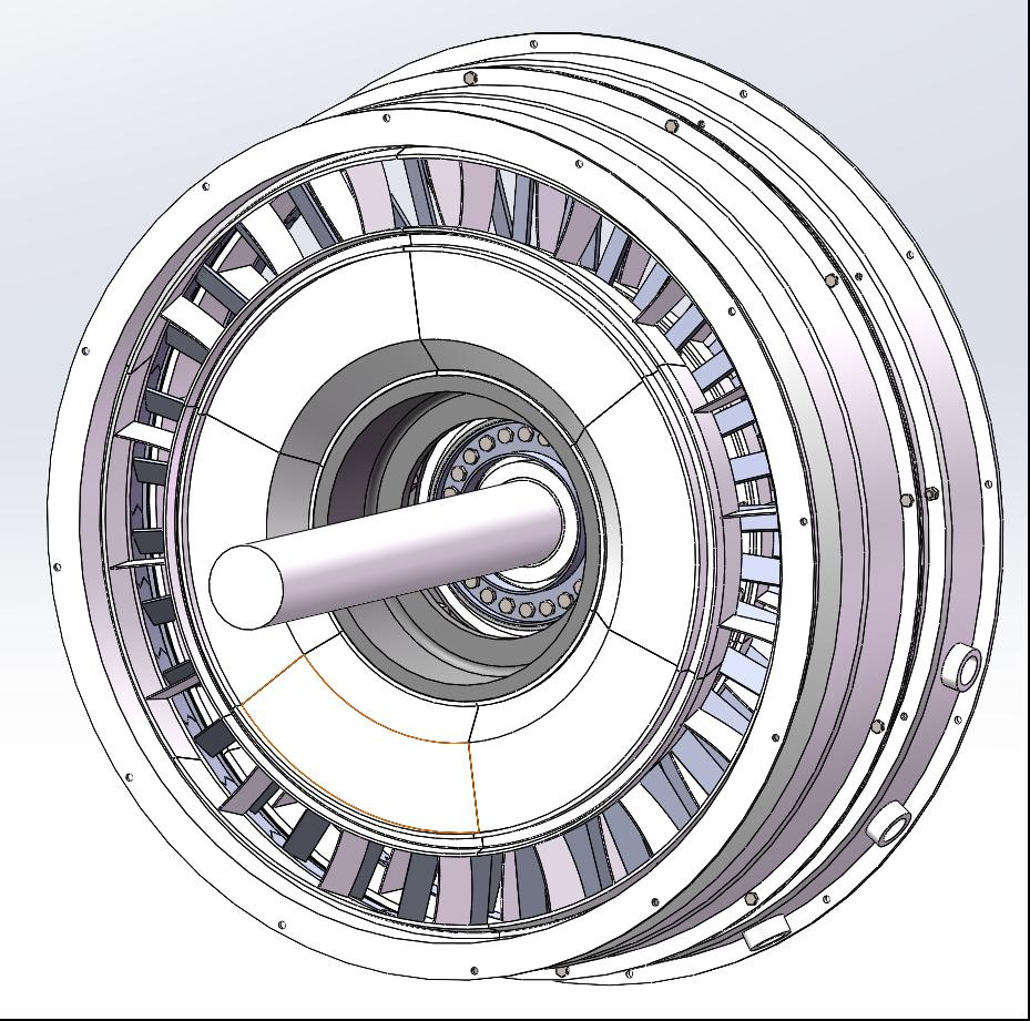 静子叶片、二导叶片、低压涡轮轴、低压涡轮轴盘、一级转子叶片内板、一级转子叶片外缘、二级转子叶片内板、二级转子叶片外缘、五角密封跑道、盘心封严环、四角封严环多使用CNC加工,材料使用铝合金。静子叶片、二导叶片两端接触面加工有装配要求,两侧弧度无精度要求,一般精度即可,材料为6061。低压涡轮轴、低压涡轮轴盘要求过盈配合,不需拆卸材料为2A12-T4。一级转子叶片内板、一级转子叶片外缘之间使用螺栓按照图纸装配要求固定,可不拆卸;二级转子叶片内板、二级转子叶片外缘同理,四者材料为2A12-T4。其余装配完后可手工反复拆卸,材料为7075。盘间封严挡板、低压二级涡轮盘、低压一级涡轮盘、二导内环块、二导叶片内缘、内环装配组件(后半)、内环装配组件(前半)、静子内缘板、二导外环焊接组件、二导叶片外缘、外环焊接组件、低压一导机匣、低压二导机匣、静子外缘板使用先铸造后CNC加工的方式,材料为ZL101A,所有配合面要求机加工保证精度,其余面要求做到可手工反复拆卸。二导到一导使用激光切割+CNC,材料为2A12。
