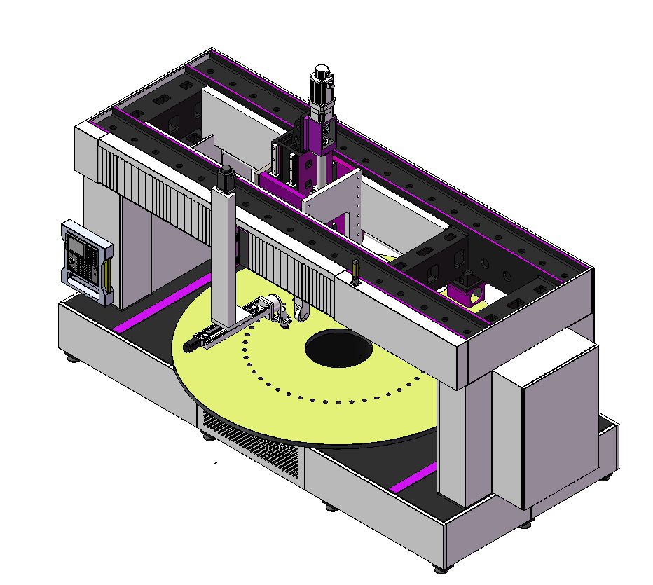 设备进给运动采用双通道CNC数控系统控制。分别控制两套运动装置。加工装置由伺服电机带动滚珠丝杆及环面蜗杆减速器实现平动及转动;加热装置由伺服电机带动滚珠丝杆实现平动,由DD马达带动中空旋转平台实现转动。