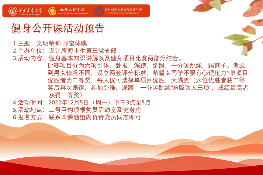 活动由设计所博士生第三党支部书记杨浩同志组织策划,副书记马泽宇同志以及特邀健身达人刘贺同学担任主持与讲解教练。健身知识科普环节首先说明了健身的好处,长期健身锻炼可以提升心肺功能,保持旺盛的体能精力,一定程度上拥有强健的体魄,可使同学们更好地服务于科研。接下来简单地介绍了人体几个重要的肌肉组成及其功能。最后系统地为大家演示了从热身到肌肉锻炼以及练后拉伸的全过程,讲解了正确动作及每一个动作的注意事项,防止大家在锻炼过程中受到不必要的伤害。在趣味比赛环节考虑到全民参与,本次比赛共设置了六项内容:引体,卧推,深蹲,倒蹬,一分钟跳绳,踢毽子。每一项比赛在全民参与的前提下根据比赛性质的不同分别设置合理的评判标准,使大家可以公平地参与其中并乐在其中。