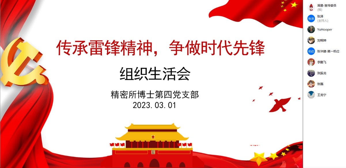 精密所博士生第四党支部全体党员在支部书记张泽同志的带领下,通过线上线下相结合的方式,组织开展了“传承雷锋精神,争做时代先锋”为主题的雷锋精神学习组织生活会。