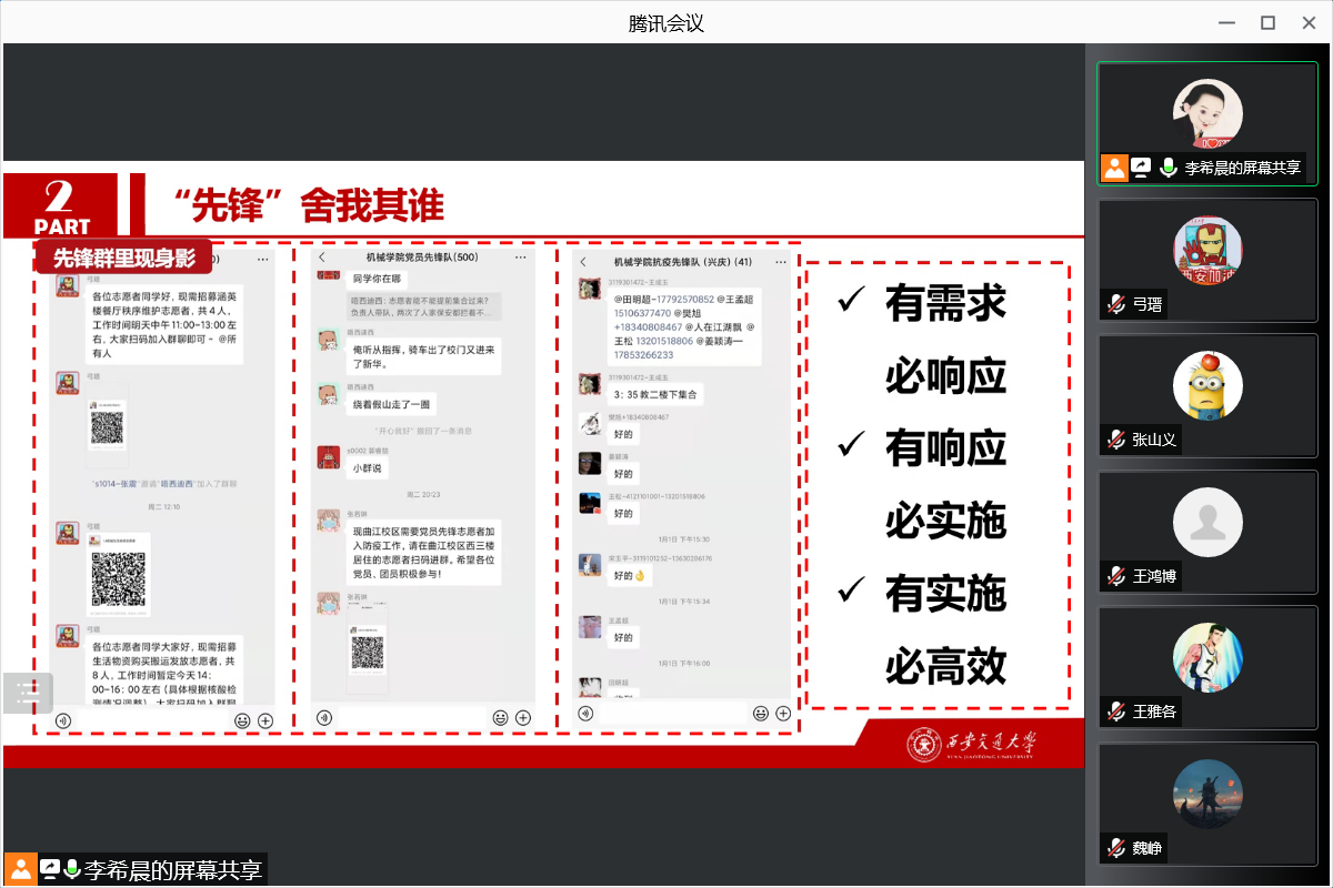 党员先锋队学生负责人,李希晨、刘蒙蒙同志分别担任教学二区、兴庆校区纵向网格负责人,殷玮、武天林等同志积极报名并参加志愿活动,此外其他同志也通过线上线下的形式助力疫情防控!大家始终牢记党员身份,戴党徽亮身份,有需求必响应、有响应必实施、有实施必高效。李希晨同志随后强调作为党员同志应注意我们的言论导向,与其被动地抱怨,不如主动地改变,我们有责任带领周围同学积极发声,传递正能量!