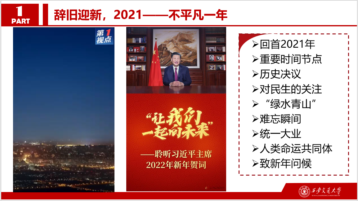 紧接着带领我们回顾了2021年极不平凡的一年,重温了习近平总书记的新年致辞。2021年注定意义非凡,中国共产党百年诞辰,“两个一百年”在这里交汇;“十四五”规划开始实施,全面建设社会主义现代化国家新征程。我们坚信,在党的坚强领导下,2022年我国一定会取得更加优异的“成绩”!