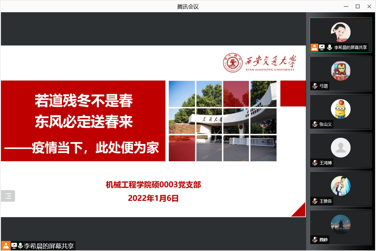 2022年1月6日晚,硕0003党支部召开疫情防控专题组织生活会,支部成员全体参会。支部书记李希晨同志首先表达了对各校区同学的关心,其次向大家介绍了疫情的最新动态和学校学院的政策制度,提醒大家注意隔离、做好防护,相信党和国家和人民的力量!