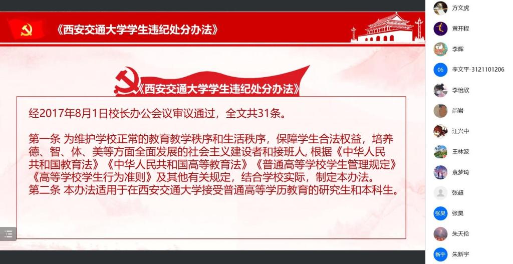 大学生违纪处分办法》,并着重强调了我校法规中网络使用的有关规定,严格要求党员同志们不得编造或传播虚假、有害信息,以身作则,弘扬先锋模范精神。