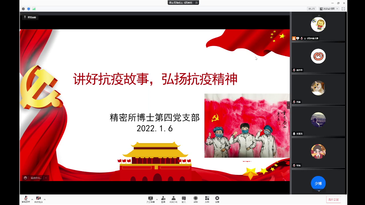 中华人民共和国成立72周年之际,中国共产党发布了《第一批纳入中国共产党人精神谱系》,将抗疫精神纳入其中。抗疫精神是在抗击新冠肺炎中形成的众志成城抗击疫情的精神,概括为:生命至上,举国同心,舍生忘死,尊重科学,命运与共。1月6日,精密所博士第四支部书记王飞组织全体同志召开了线上组织生活会,总结封城隔离期间的生活和学习经验,坚定抗疫思想,学习抗疫精神。本次生活会是在抗疫关键时刻召开的一次重要总结会议。